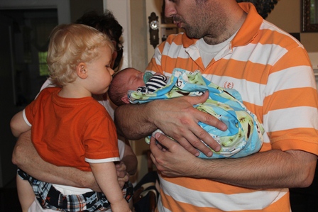 Wow! It is hard to believe that Brooks is already 10 days old! He has the sweetest personality. He is very laidback and hardly anything bothers him. He is eating 60mL or 2 ounces every three hours. I have to wake him up for his two night/early morning feedings. For the most part, he loves to be swaddled, but usually manages to get his arms out and hold them up to his face. He likes to cuddle and roll up like a little ball! The rest of his cord fell off early this morning. Poor thing has a terrible diaper rash, but he is still being really good!